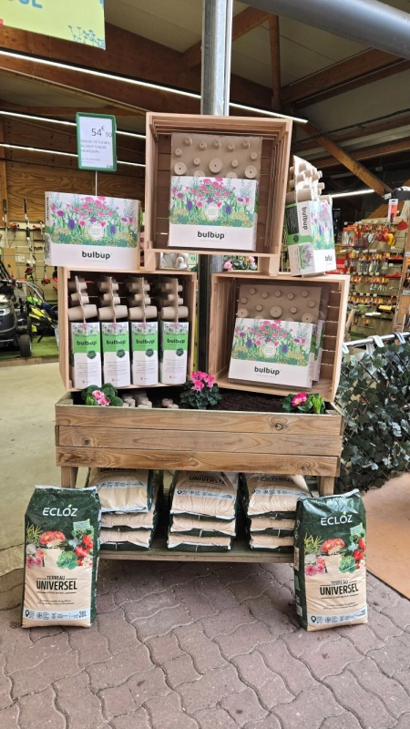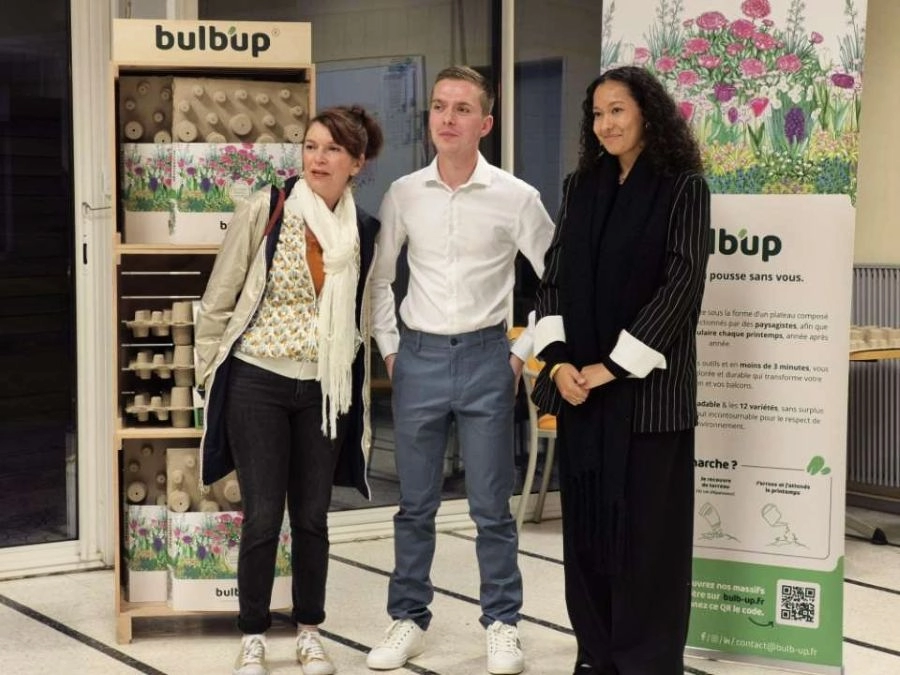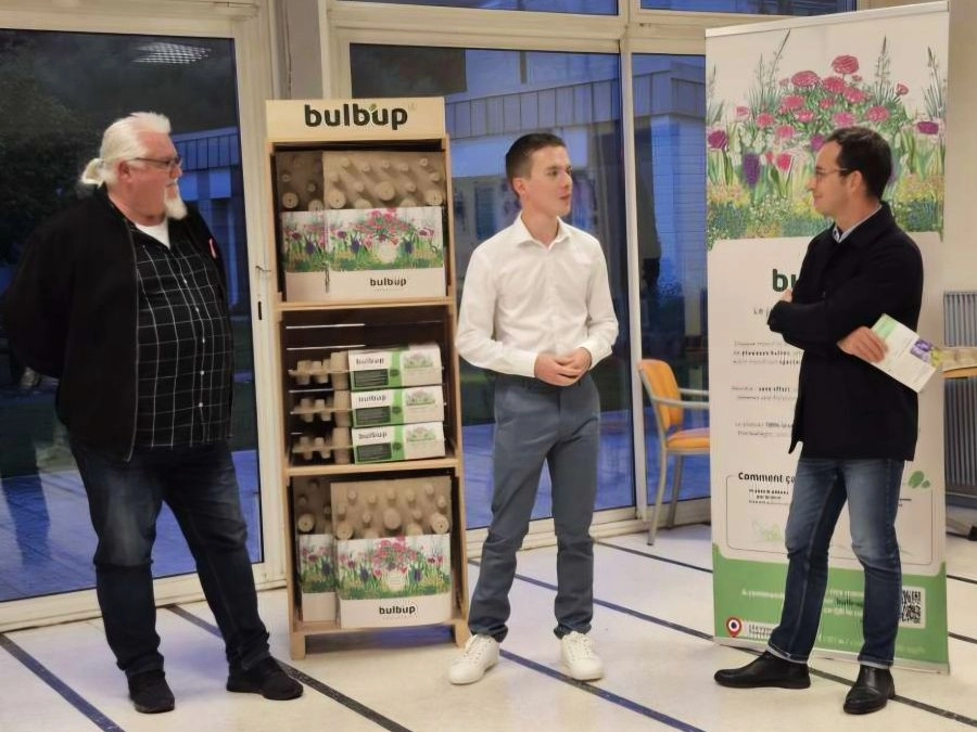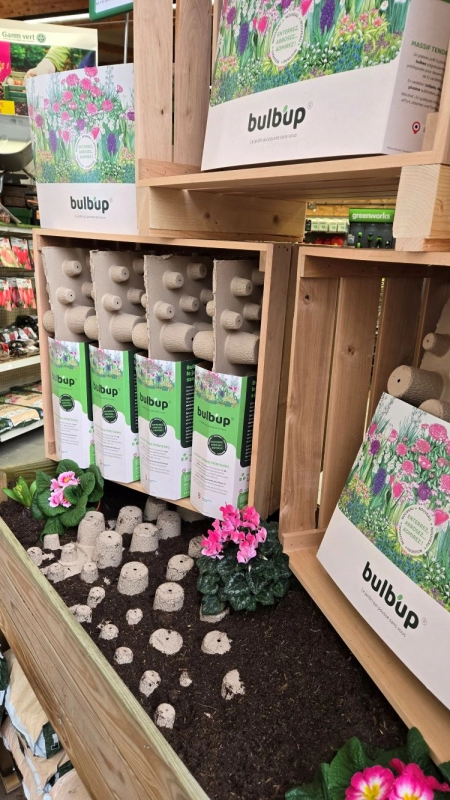 Ainsi est né Bulb’Up, une plaque en cellulose moulée, 100 % biodégradable qui intègre directement des bulbes de fleurs. Il suffit de la poser, de recouvrir légèrement, d’arroser… et quelques semaines plus tard, un massif fleuri apparaît, sans plantation bulbe par bulbe. Une innovation accessible, cohérente avec son parcours et qui séduit déjà des figures reconnues comme Stéphane Marie de Silence, ça pousse !